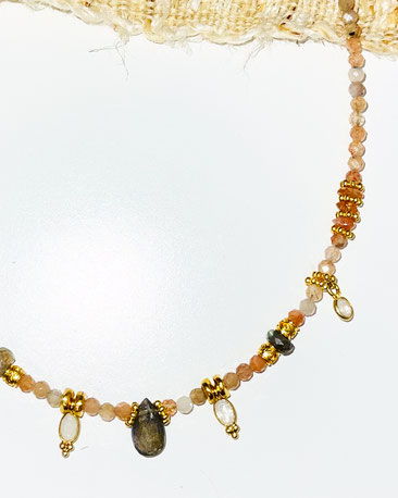 Collier réglable composé d'un joli enfilage de pierres naturelles. Fermoir mousqueton et chainette de réglage.